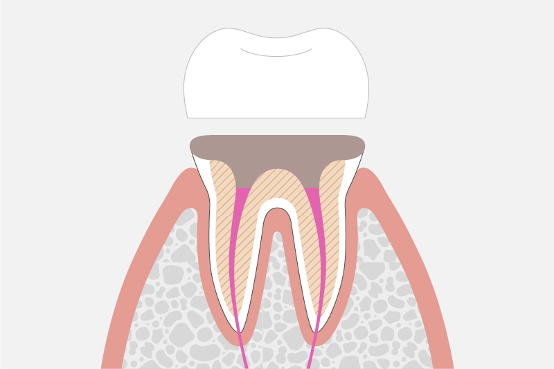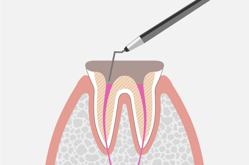 歯の中を通る根管(血管や神経などの通り道)から、虫歯に汚染されている部分を取り除き、内部をキレイに洗浄・消毒してから薬剤を詰め、被せ物をして補います。